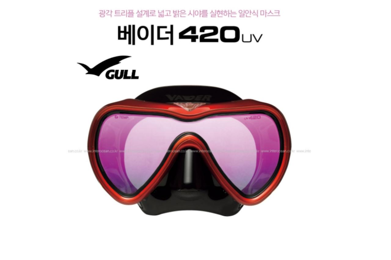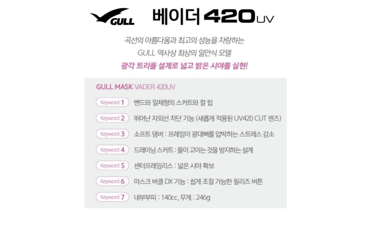 Vader 420UVIt has the beauty of curves and the best performance The best monocular model in GULL historyWide-angle triple design for a wide and bright view!One-sided mask with wide-angle triple design for a wide and bright viewGULL MASK VADER 420UV Keyword1-Band integrated skirt and curl2- Outstanding UV protection (new UV420 CUT lens)3-Soft Damber: Reduce the stress of the frame compressing the cheekbones4-Draining Skirt: Designed to prevent water retention5-Centre Frameless: Gain a wide view6-Mask Buckle DX Function: Easy adjustable release button7-Inner volume: 140 cc, weight: 246 g