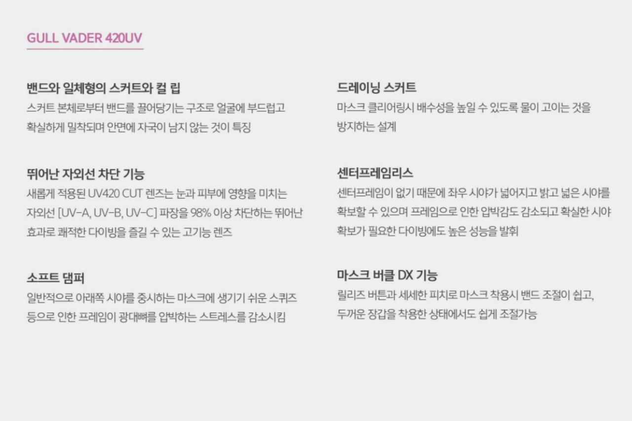 Vader 420UV It has the beauty of curves and the best performance The best monocular model in GULL history Wide-angle triple design for a wide and bright view! One-sided mask with wide-angle triple design for a wide and bright view GULL MASK VADER 420UV Keyword 1-Band integrated skirt and curl 2- Outstanding UV protection (new UV420 CUT lens) 3-Soft Damber: Reduce the stress of the frame compressing the cheekbones 4-Draining Skirt: Designed to prevent water retention 5-Centre Frameless: Gain a wide view 6-Mask Buckle DX Function: Easy adjustable release button 7-Inner volume: 140 cc, weight: 246 g