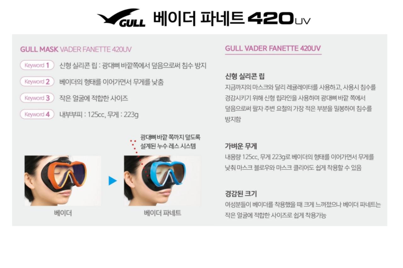 Vader Pannet 420UVCurvilinear beauty! a monocular mask that fits a small faceGULL MASK VADER FANETTE 420UV Keyword1-New silicone lip: Prevent flooding by covering the outside of cheekbones2-Lower weight while continuing to form a vader3-Size for small face4-Inner volume: 125 cc, weight: 223 g