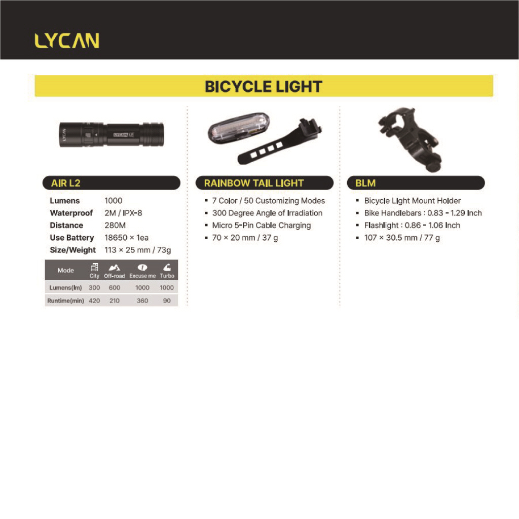 • Lumens 1200• Waterproof 100M/IPX-8• Sight Coverage 170°• Color Temperature 5500K• Use Battery 18650(1ea)• Size/Weight 130 x 40 mm/125 g