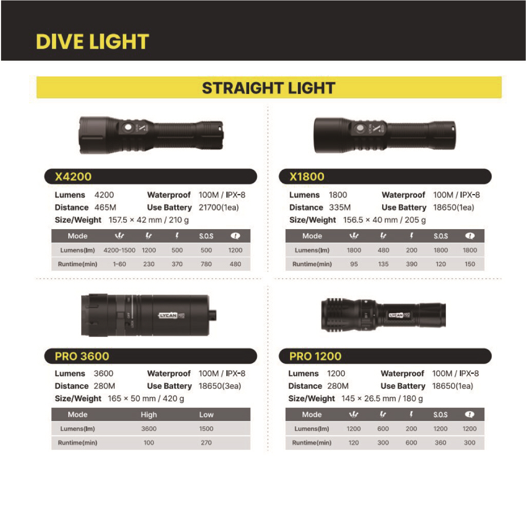 • Lumens 4200• Waterproof 100M / IPX-8• Distance 465M• Use Battery 21700(1ea)• Size/Weight 157.5 x 42 mm / 210 g