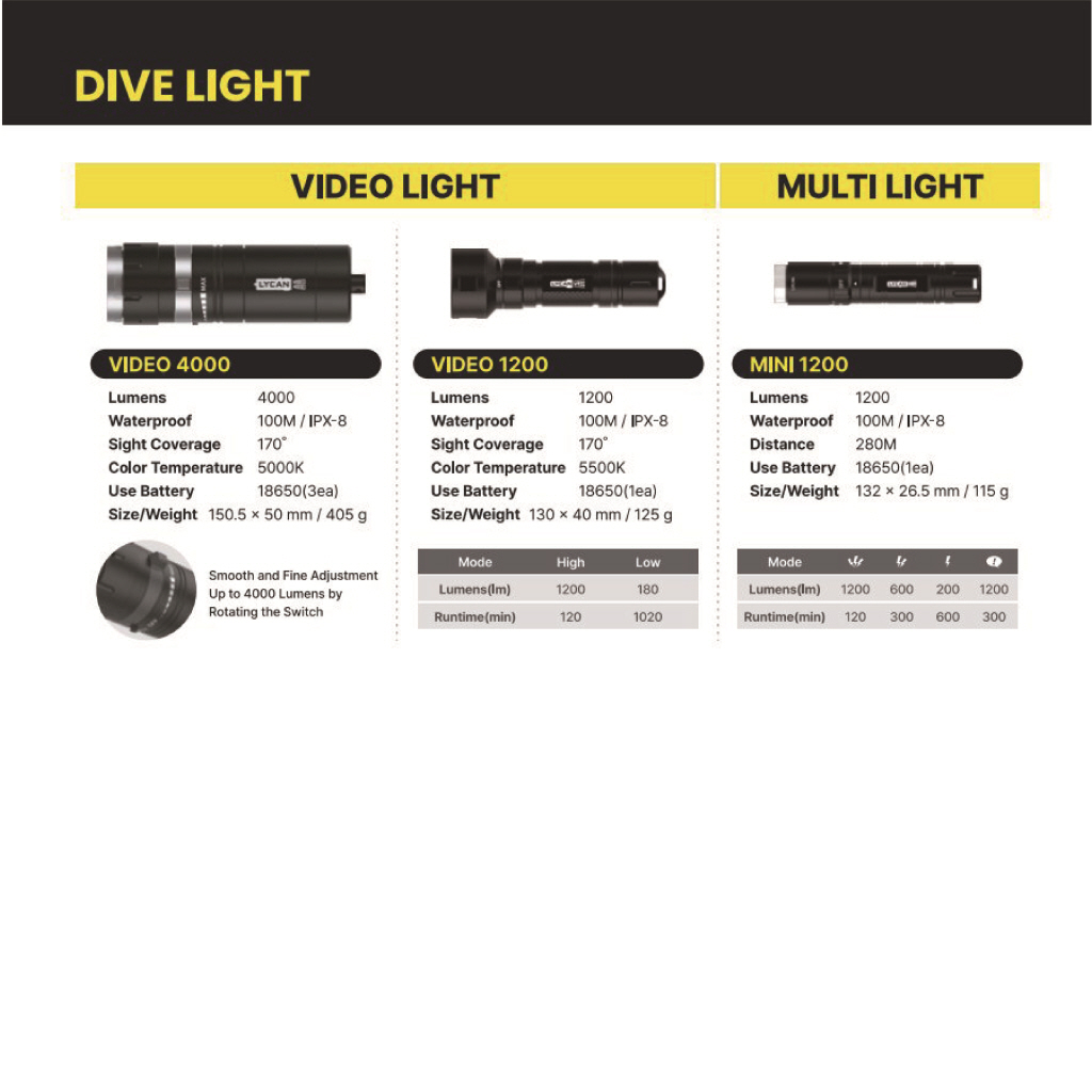 • Lumens 4000• Waterproof 100M/IPX-8• Sight Coverage 170°• Color Temperature 5000K• Use Battery 18650(3ea)• Size/Weight 150.5 x 50 mm/405 g