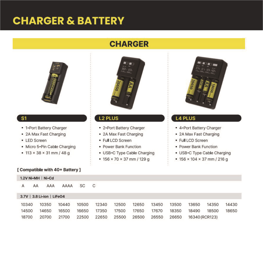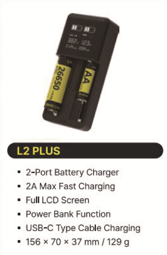 • 2-Port Battery Charger • 2A Max Fast Charging • Full LCD Screen• Power Bank Function• USB-C Type Cable Charging • 156 x 70 x 37 mm/129 g