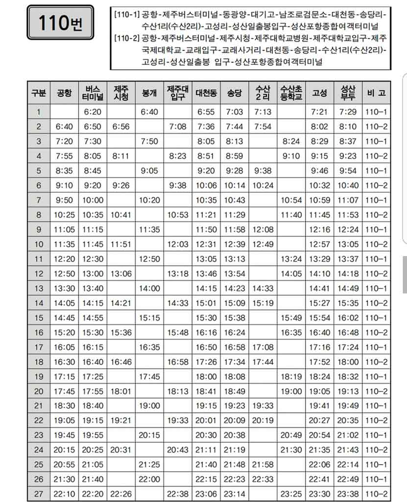 • It takes about 50 minutes (about 30,000 won) by taxi from Jeju International Airport• Free pickup/sanding on a diving basis of 5 or more times for 6 people • Paid offer - KRW 50,000 one way (based on one 11-seater van - up to 5-7 people can ride in Goryeo City, including diving bags)• How to use a direct bus (110) from Jeju Airport: It takes about an hour (get off at the entrance of Seongsan Ilchulbong) See the picture above for the timetable. (Last)